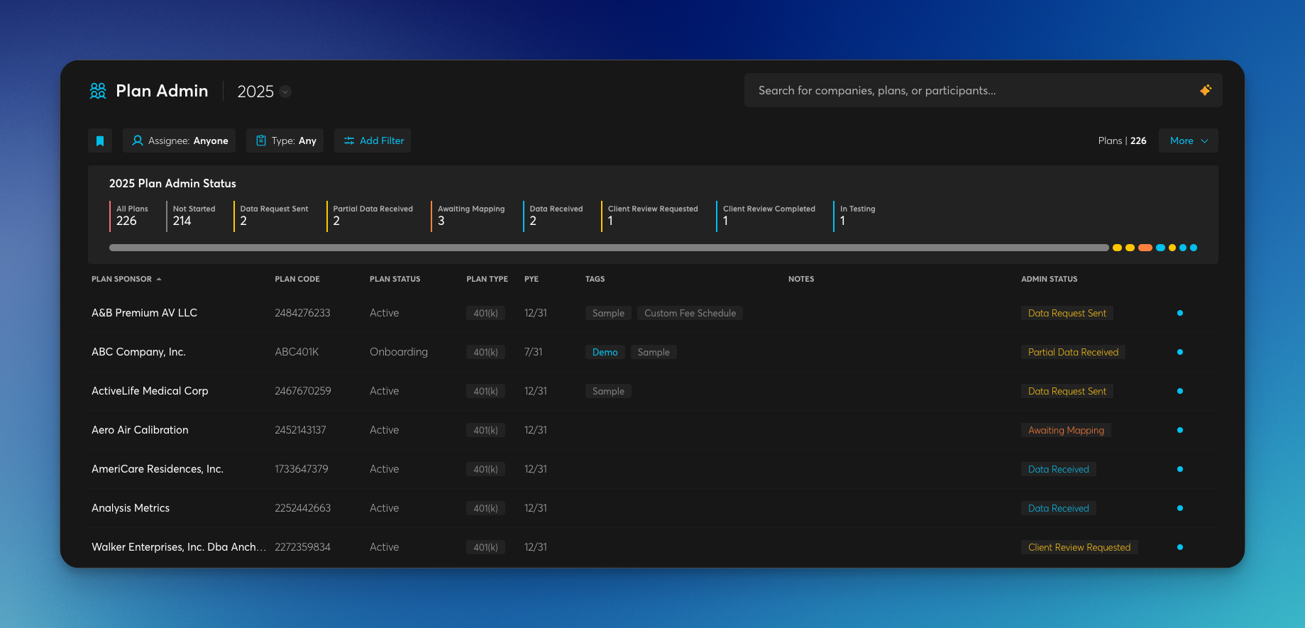 Plan Admin Page Updates - Fixed filter inconsistencies, added sort options to table columns, added Company Tags filter option, and added a column to display company-level tags for better plan administration visibility.