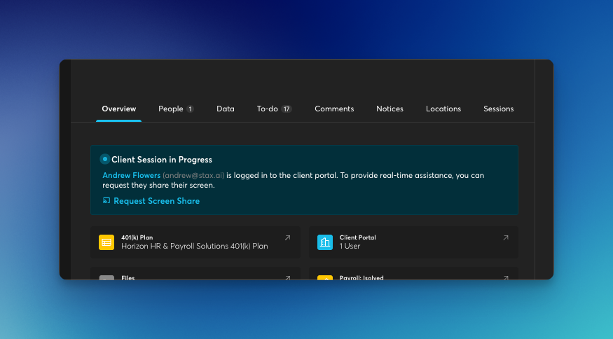 We have implemented a live screen sharing feature that allows you to request and view a client's screen in real-time when they are active in the client portal. This enables you to provide immediate assistance and guidance to clients, improving your ability to troubleshoot issues and support client interactions without requiring separate screen sharing tools.