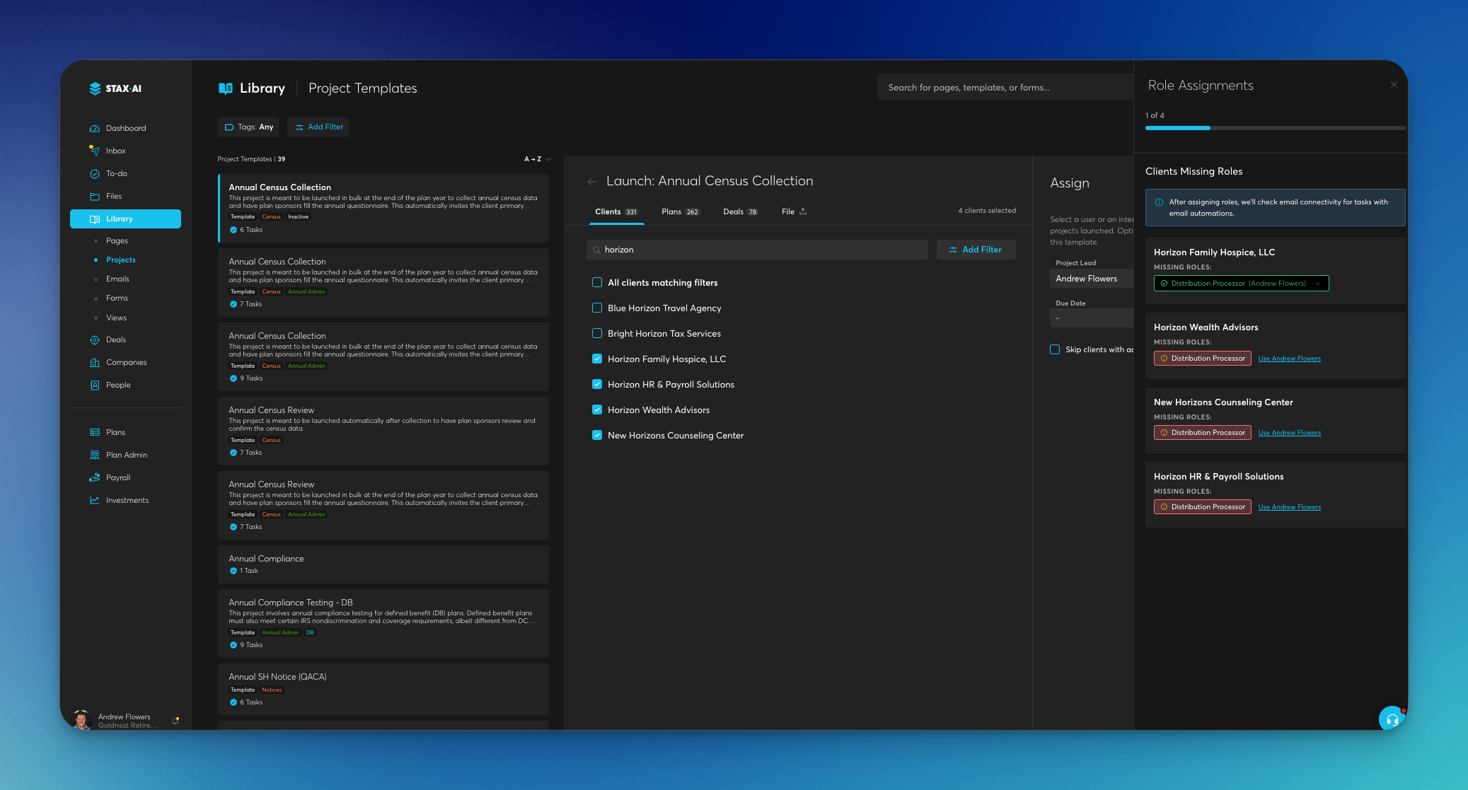 We have implemented a role assignment check when launching projects that prompts you to assign any missing client roles before project launch. This ensures all required roles are properly configured upfront, preventing workflow interruptions and ensuring tasks are assigned to the correct team members from the start.