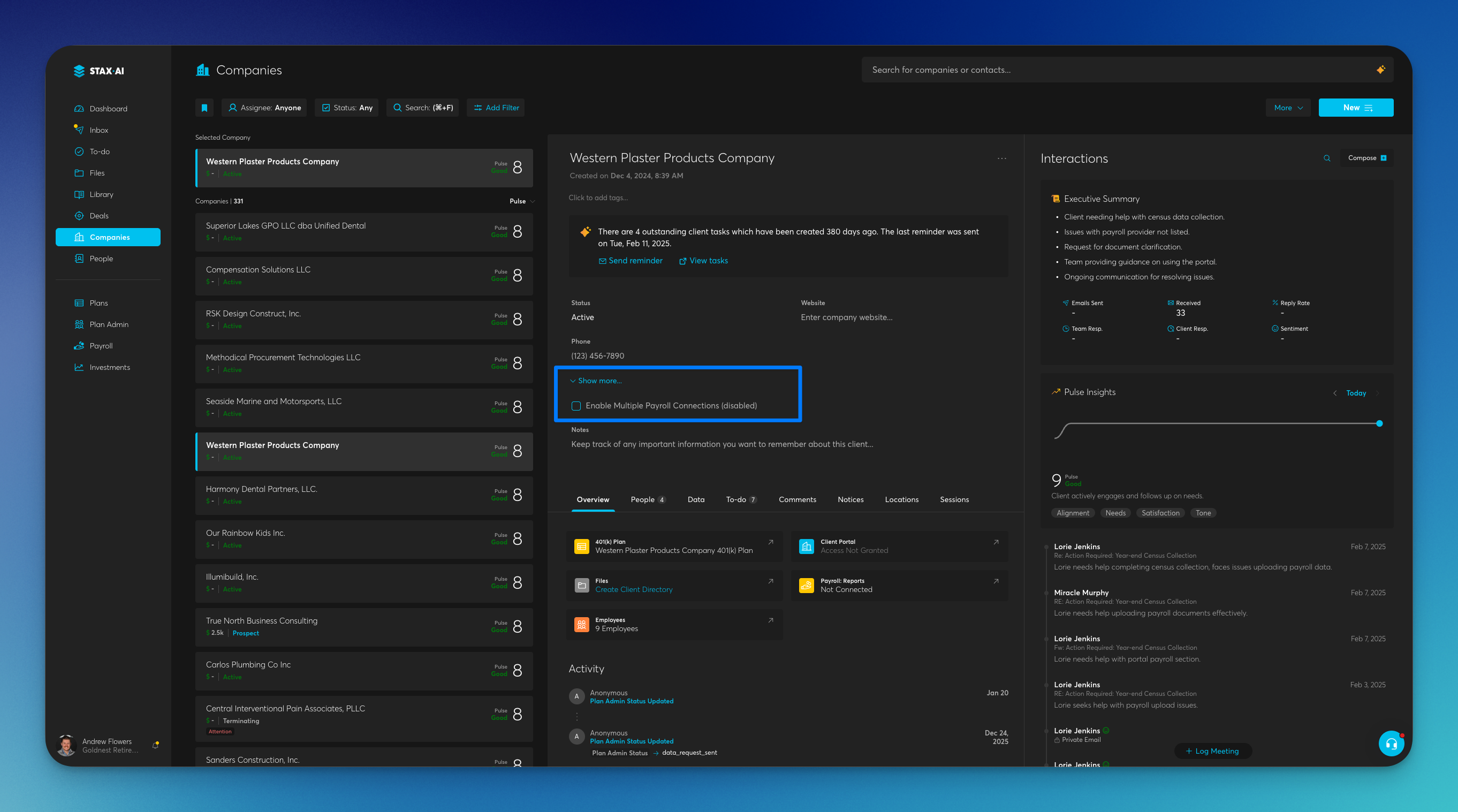 Multiple Payroll Client Controls: We have added a client-level setting that allows you to enable multiple payroll connections per plan sponsor. On the client overview page (above the notes field), a new "Enable Multiple Payroll Connections" option lets you turn this on when your service agreement supports it; when enabled, plan sponsors can connect more than one payroll in the Client Portal.